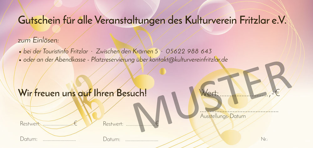 Gutscheine, mit beliebigem Wert, können über unser Kontaktformular bestellt werden.